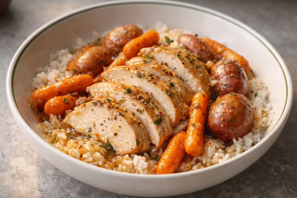 This is one of those slow cooker meals that looks so appealing — tender chicken, baby potatoes, carrots, all cooked together and served over rice. It’s easy, family-friendly, and perfect for busy days.