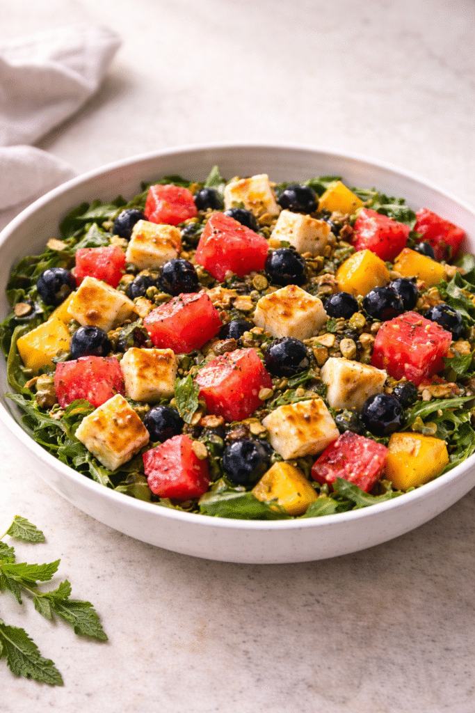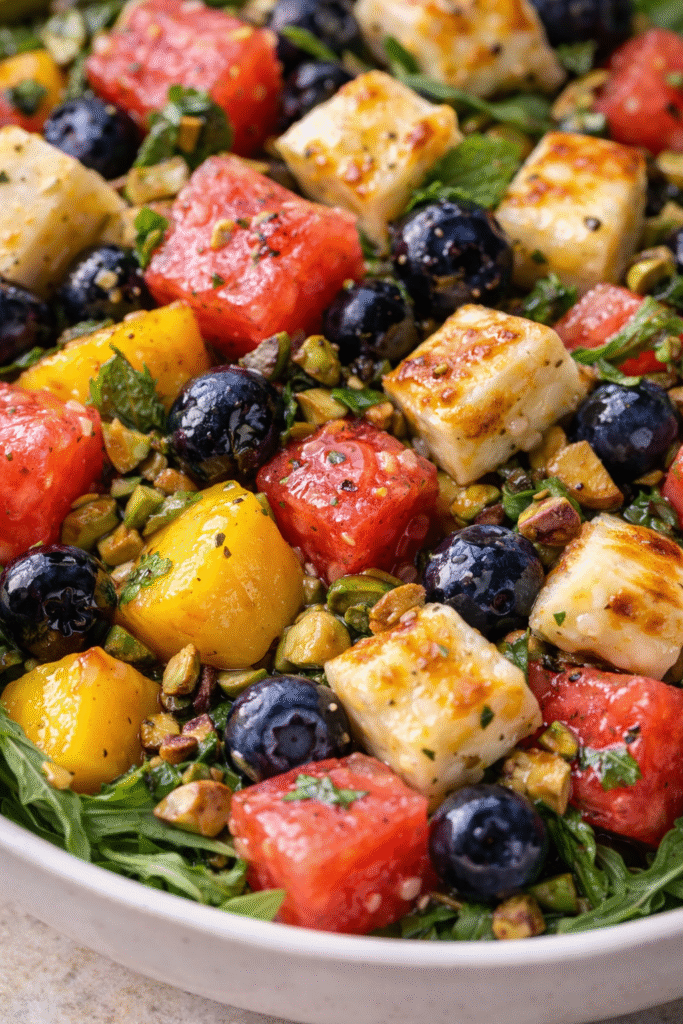 If you love fresh, vibrant salads that feel restaurant-worthy but are surprisingly simple to make, this one is for you. Sweet watermelon and mango, peppery arugula, juicy blueberries, warm golden halloumi, crunchy pistachios, and a bright citrus honey dressing come together in the most refreshing way.